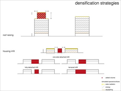 This project, part of my master thesis, investigated the impact of soft-densification scenarios on built density and urban performance indicators by developing a parametric model based on a 3D cadastre. Two areas were analysed in central and suburban Geneva where current bylaws allow for roof-raising and suburban infilling interventions in order to incease built density and tackle housing shortage. The analysis highlighted the poor daylight access in high-density urban areas, as well as the limited contribution of roof-stacking to the densification processes.